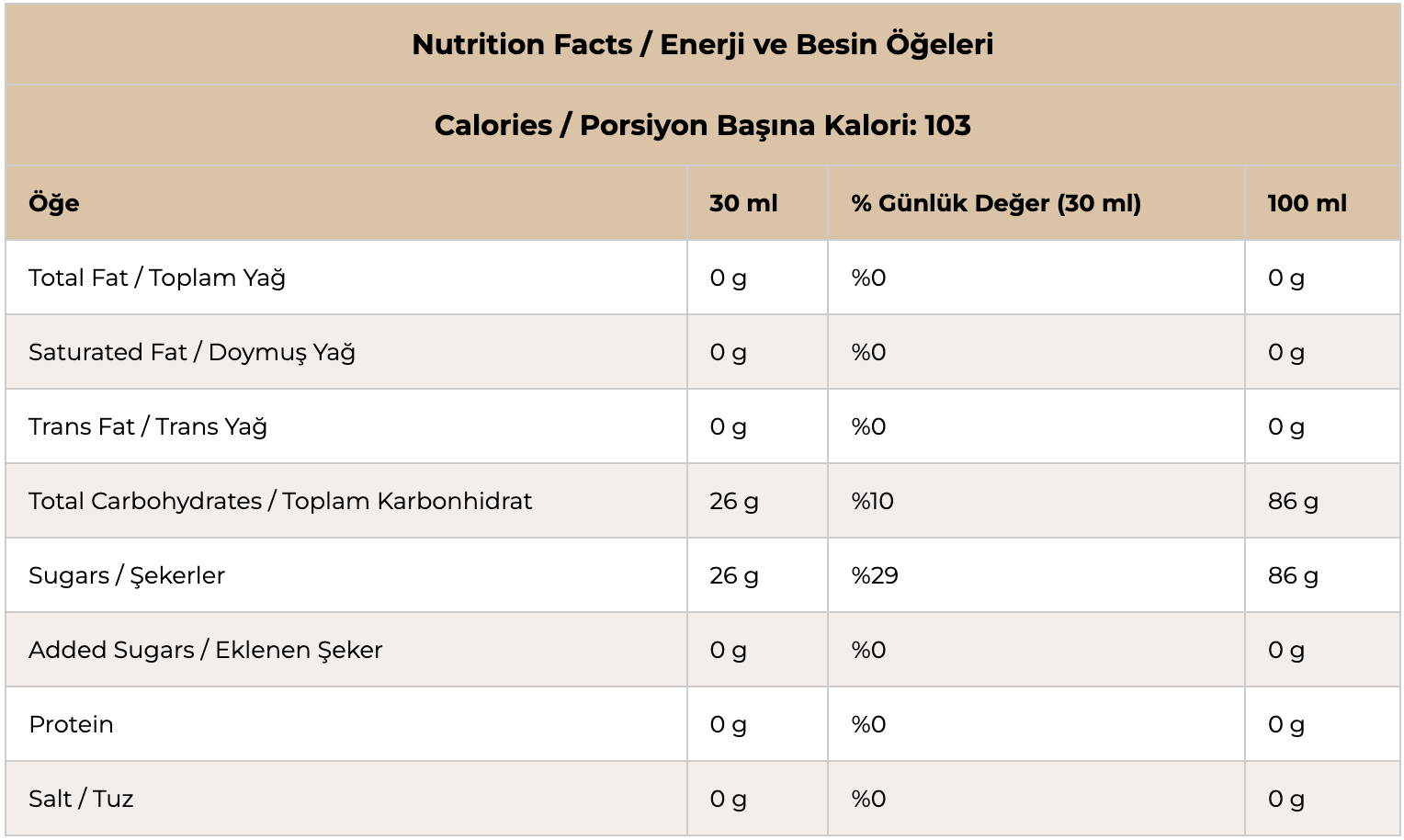 | Total Fat / Toplam Yağ | 0 g | %0 | 0 g |